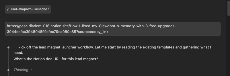Builder's notes → I built a Claude skill that creates an entire lead magnet funnel from a single Notion URL - landing page, thank-you page, n8n email workflow, Vercel routes, done in 5 minutes. Plus a /truncate skill that actually cuts text like a human editor, and 3 free upgrades that fixed my Clawdbot's memory.